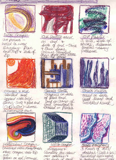 I think the objects look the most solid of all drawings in this section as they are rendered in colour and contain text and motifs. However, at the same time this seems to detract somewhat from the look of 3D form, because of my faulty attempts with the perspective in the text and motifs in many places. As these drawings contain the most texture, this also helps to give them the most solidity. They would certainly have more depth and solidity if I'd used tonal shading and had made some of the objects fuzzier than others – giving more emphasis to just a couple of objects, but rightly or wrongly, as it wasn’t part of the brief, I didn’t use it.